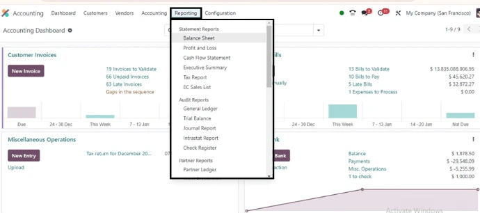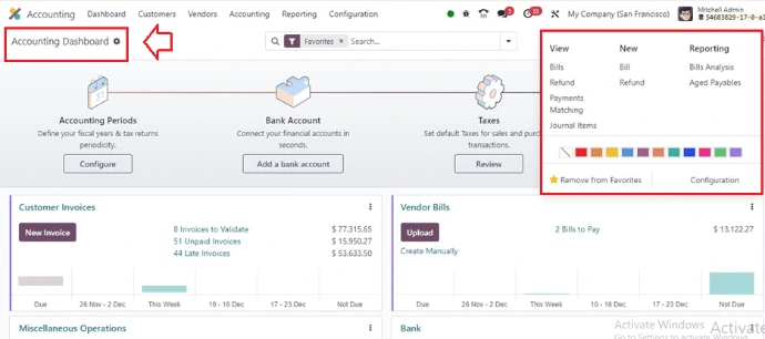 The Odoo Accounting dashboard provides a clear overview of your financial activities in one place. Track invoices, bills, bank balances, and key financial data in real time to manage your business efficiently.